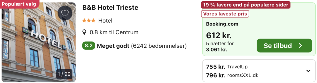 Bemærk: Husk at lade søgningen blive helt færdig. Vælg Laveste Pris på Trivago. Der kan være mindre prisforskelle på mobil og pc. Undersøg med fordel, hvor det er billigst inden bestilling.