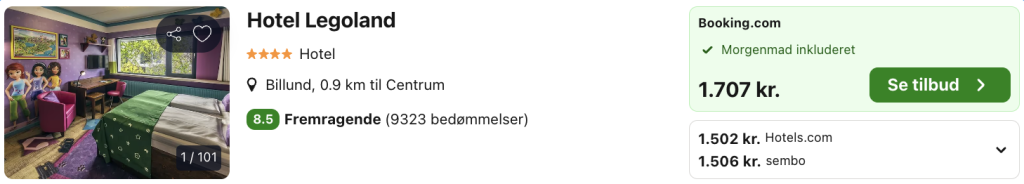 Bemærk: Den samlede pris for hotellet koster 1.502,- for fire personer i et Lego værelse, hvilket er 376,- pr person.