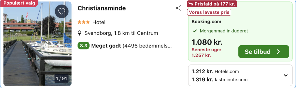 ![]() Bemærk: Den samlede pris for opholdet er 1.080,- for 2 personer i et dobbeltværelse, hvilket svarer til 540,- per person. Der kan være mindre prisforskelle på mobil og pc. Undersøg med fordel, hvor det er billigst inden bestilling. Rejs365 er ikke et rejsebureau, men en rejseside, der finder gode tilbud! – Vi modtager kommission, men det påvirker ikke din pris! Læs mere her |
