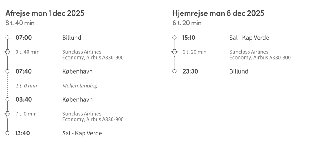 Hvis rejsen er med “Vis fly” og “Vis hotel” link, så er der tale om en sammensat rejse. Det vil sige at fly og hotel skal bestilles hver for sig. Prisen vi angiver vil dog være samlet for fly og hotel med mindre andet er angivet.