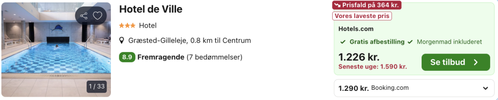 Bemærk: Den samlede pris for opholdet er 1.226,- for 2 personer i et dobbeltværelse hvilket svarer til 613,- per person. 3-timers spa adgang, som inkluderer dampbad, opvarmet indendørs og udendørs swimmingpools, mahognisauna, finsk sauna og sanseshower kan tilkøbes her Der kan være mindre prisforskelle på mobil og pc. Undersøg med fordel, hvor det er billigst inden bestilling. Rejs365 er ikke et rejsebureau, men en rejseside, der finder gode tilbud! – Vi modtager kommission, men det påvirker ikke din pris! Læs mere her |