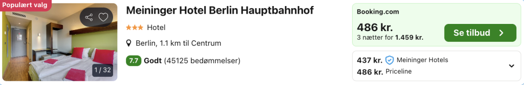 Bemærk: Den samlede pris for hotellet er 1.312,- for 2 personer i et dobbeltværelse, hvilket svarer til 656,- per person.