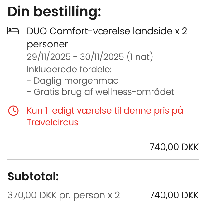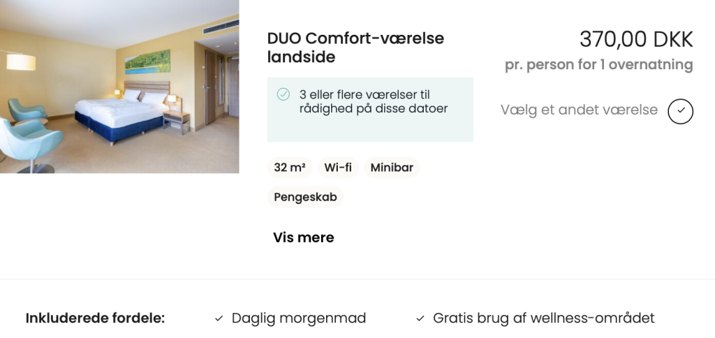![]() Bemærk: Den samlede pris for opholdet er 740,- for 2 personer i et dobbeltværelse, hvilket svarer til 370,- per person. Der er mange tilgængelige datoer. Rejs365 er ikke et rejsebureau, men en rejseside, der finder gode tilbud! – Vi modtager kommission, men det påvirker ikke din pris! Læs mere her