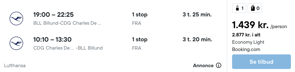Tjek altid datoerne for at se om de passer sammen før du bestiller, da vi kan have begået fejl. Tjek derudover også prisen på begge ting før du bestiller det ene, da prisen kan have ændret sig. Der kan også være små variationer i prisen mellem mobil og pc.