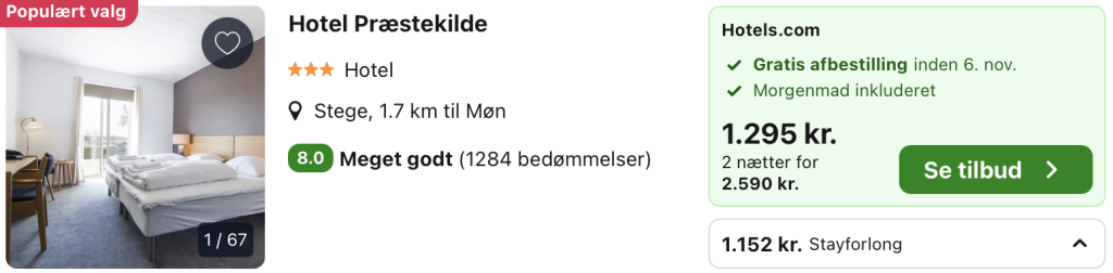 Vi har taget udgangspunkt i et ophold fra den 8. – 10. november på Hotel Præstekilde på Møn, der er et ideelt valg for dig, der søger fredelige omgivelser, natur lige uden for døren og nem adgang til øens største attraktioner. Hotellet ligger naturskønt i udkanten af Stege, direkte ved Møns Golfbane og med udsigt til både sø og skov, hvilket giver en afslappende atmosfære året rundt.