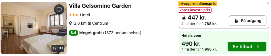 Husk at logge ind / oprette en gratis bruger på trivago samt hos hoteludbyderen. Derved opnås den bedste pris! Rejs365 er ikke et rejsebureau, men en rejseside, der finder gode tilbud! – Vi modtager kommission, men det påvirker ikke din pris! Læs mere her |