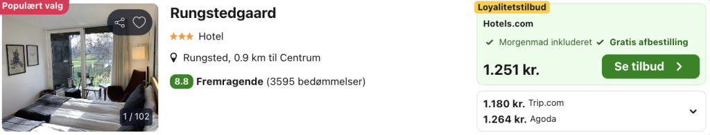 ![]() Bemærk: Den samlede pris for opholdet er 1.180,- for 2 personer i et dobbeltværelse, hvilket svarer til 590,- per person. Der kan være mindre prisforskelle på mobil og pc. Undersøg med fordel, hvor det er billigst inden bestilling. Rejs365 er ikke et rejsebureau, men en rejseside, der finder gode tilbud! – Vi modtager kommission, men det påvirker ikke din pris! Læs mere her |
