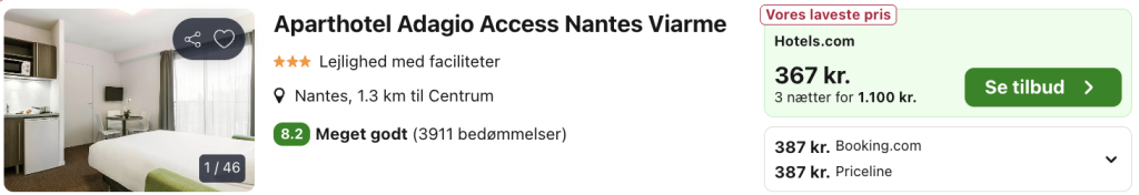 Vi har taget udgangspunkt i det 3-stjernede Aparthotel Adagio Access Nantes, der modtager meget gode anmeldelser af de tidligere gæster og bl.a. byder på pæne værelser og central beliggenhed!