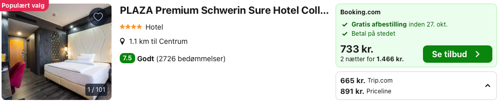 Bemærk: Den samlede pris for opholdet er 1.329,- for 2 personer i et dobbeltværelse, hvilket svarer til 665,- per person. Der kan være mindre prisforskelle på mobil og pc. Undersøg med fordel, hvor det er billigst inden bestilling. Rejs365 er ikke et rejsebureau, men en rejseside, der finder gode tilbud! – Vi modtager kommission, men det påvirker ikke din pris! Læs mere her |