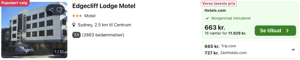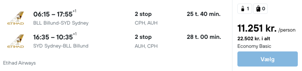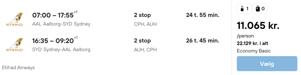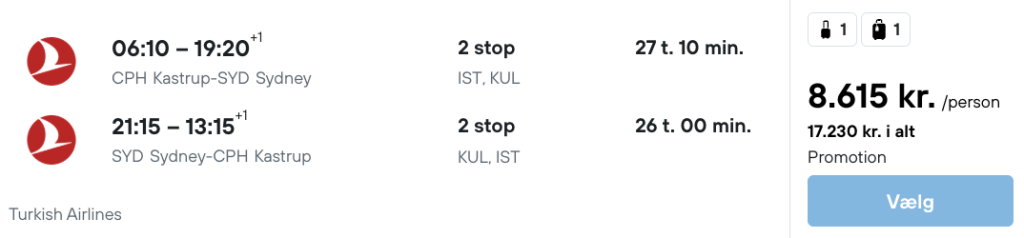 Vær opmærksom på at udrejse er den 27. november, mens ankomst i Sydney er den 28. november. Dette er der taget højde for i hotel overnatning. Rejs365 er ikke et rejsebureau, men en rejseside, der finder gode tilbud! – Vi modtager kommission, men det påvirker ikke din pris! Læs mere her |