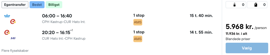Vær opmærksom på, at flyet vi har taget udgangspunkt i er med egentransfer. Husk at tage højde for at der skal være tid til at hente bagage og checke ind påny i Amsterdam.