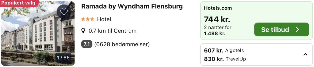 Vi har taget udgangspunkt i et ophold fra den 6. – 8. december på det 3-stjernede Ramada by Wyndham Flensborg. Hotellet modtager gode anmeldelser af de tidligere gæster og bl.a. byder på flotte værelser og central beliggenhed i Flensborg.