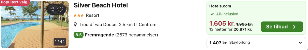 Hvis rejsen er med “Vis fly” og “Vis hotel” link, så er der tale om en sammensat rejse. Det vil sige at fly og hotel skal bestilles hver for sig. Prisen vi angiver vil dog være samlet for fly og hotel med mindre andet er angivet.