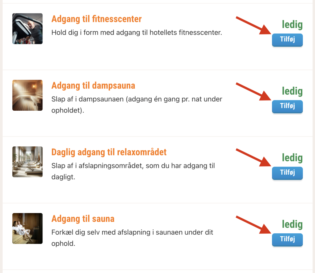 Husk at tilføje adgang til fitnesscenter, dampsauna, relaxområdet og sauna inden betaling.