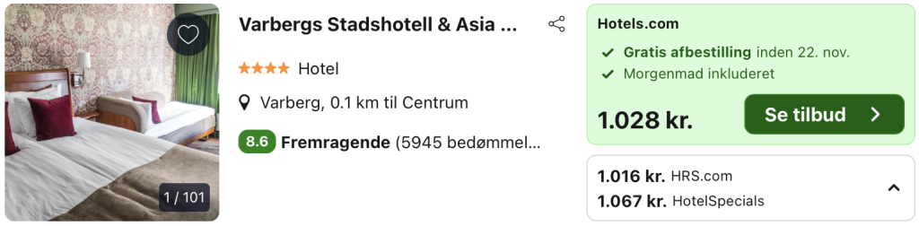 Den samlede pris for opholdet er 1.018,- for 2 personer i et dobbeltværelse, hvilket svarer til 509,- per person. Der kan være mindre forskelle på priser på mobil og pc. Undersøg med fordel, hvor det er billigst inden bestilling. Rejs365 er ikke et rejsebureau, men en rejseside, der finder gode tilbud! – Vi modtager kommission, men det påvirker ikke din pris! Læs mere her