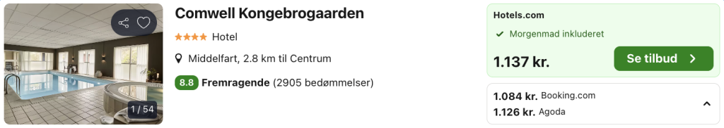 Bemærk: Den samlede pris for opholdet er 1.084,- for 2 personer i et dobbeltværelse, hvilket svarer til 542,- per person. Der kan være mindre prisforskelle på mobil og pc. Undersøg med fordel, hvor det er billigst inden bestilling. Rejs365 er ikke et rejsebureau, men en rejseside, der finder gode tilbud! – Vi modtager kommission, men det påvirker ikke din pris! Læs mere her |