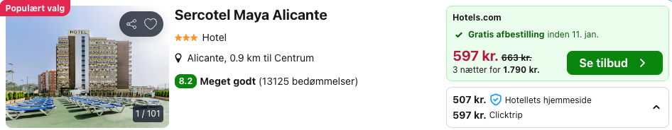 Hvis rejsen er med “Vis fly” og “Vis hotel” link, så er der tale om en sammensat rejse. Det vil sige at fly og hotel skal bestilles hver for sig. Prisen vi angiver vil dog være samlet for fly og hotel med mindre andet er angivet.