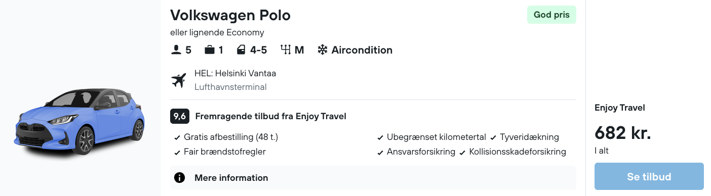 Den samlede pris for leje af bil er 682,- hvilket svarer til 341,- per person ved 2 personer. |