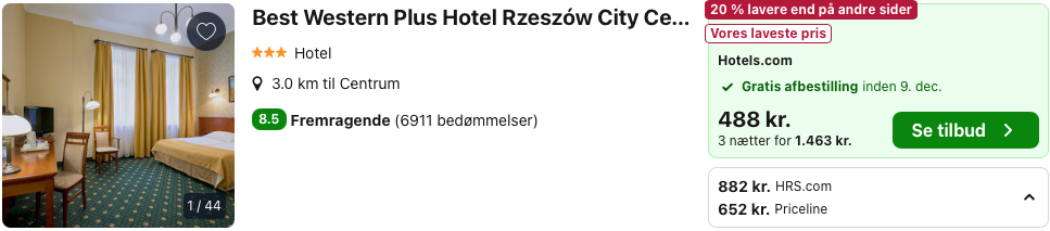 | Bemærk: Den samlede pris for hotellet er 1.463,- for 2 personer i et dobbeltværelse, hvilket svarer til 732,- per person. |