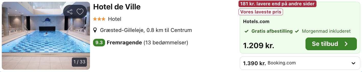 Bemærk: Den samlede pris for opholdet er 1.209,- for 2 personer i et dobbeltværelse hvilket svarer til 605,- per person. 3-timers spa adgang, som inkluderer dampbad, opvarmet indendørs og udendørs swimmingpools, mahognisauna, finsk sauna og sanseshower kan tilkøbes. Der kan være mindre prisforskelle på mobil og pc. Undersøg med fordel, hvor det er billigst inden bestilling. Rejs365 er ikke et rejsebureau, men en rejseside, der finder gode tilbud! – Vi modtager kommission, men det påvirker ikke din pris! Læs mere her |