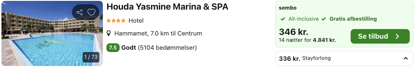Hvis rejsen er med “Vis fly” og “Vis hotel” link, så er der tale om en sammensat rejse. Det vil sige at fly og hotel skal bestilles hver for sig. Prisen vi angiver vil dog være samlet for fly og hotel med mindre andet er angivet.
