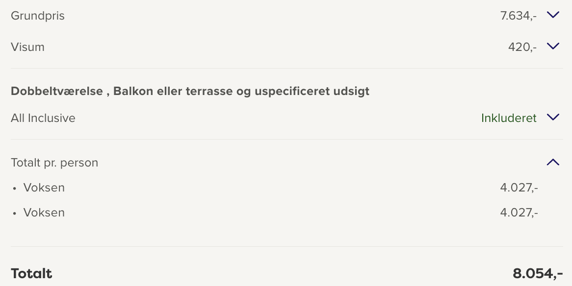 Prisen tager udgangspunkt i 2 personer. Man kan oftest rejse flere voksne og eller med børn og derved typisk opnå en billigere pris pr. person.