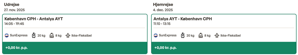 Hvis rejsen er med “Vis rejse” link, så er der tale om en pakkerejse, hvor fly og hotel bestilles på en gang.