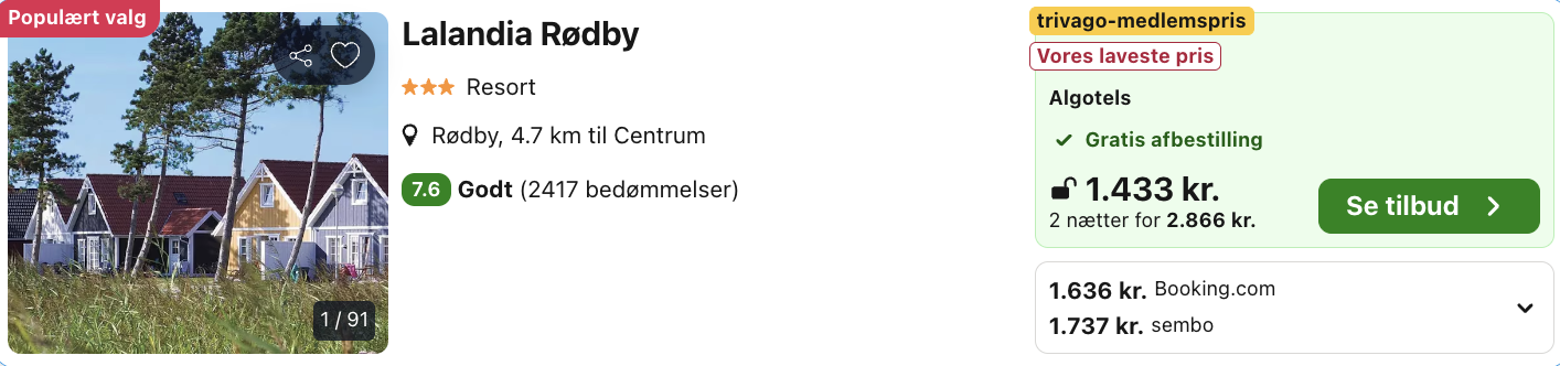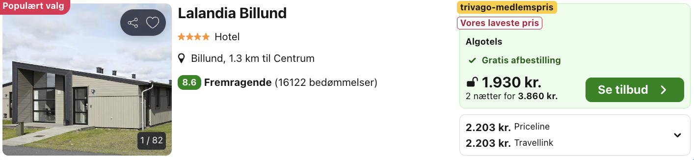 Den samlede pris for opholdet i Søndervig er 3.668,- for 4 personer i en feriebolig, hvilket svarer til 917,- per person. Den samlede pris for opholdet i Billund er 3.860,- for 4 personer i en feriebolig, hvilket svarer til 965,- per person. Rejs365 er ikke et rejsebureau, men en rejseside, der finder gode tilbud! – Vi modtager kommission, men det påvirker ikke din pris! Læs mere her |