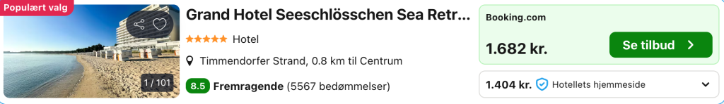 Grand Hotel Seeschlösschen Sea Retreat & SPA er et eksklusivt 5-stjernet strandhotel, der ligger direkte ved den brede sandstrand i Timmendorfer Strand ved Østersøen. Her mødes klassisk elegance og moderne komfort i en atmosfære, hvor der er kræset for detaljerne, og hvor både afslapning og luksus er i fokus. Hotellets store wellnessområde er en oplevelse i sig selv. Her kan du nyde en indendørs pool, forskellige saunaer, dampbad og et bredt udvalg af spa- og skønhedsbehandlinger, der skaber de perfekte rammer for velvære og fornyet energi. Der er også mulighed for yoga, fitness og golf.