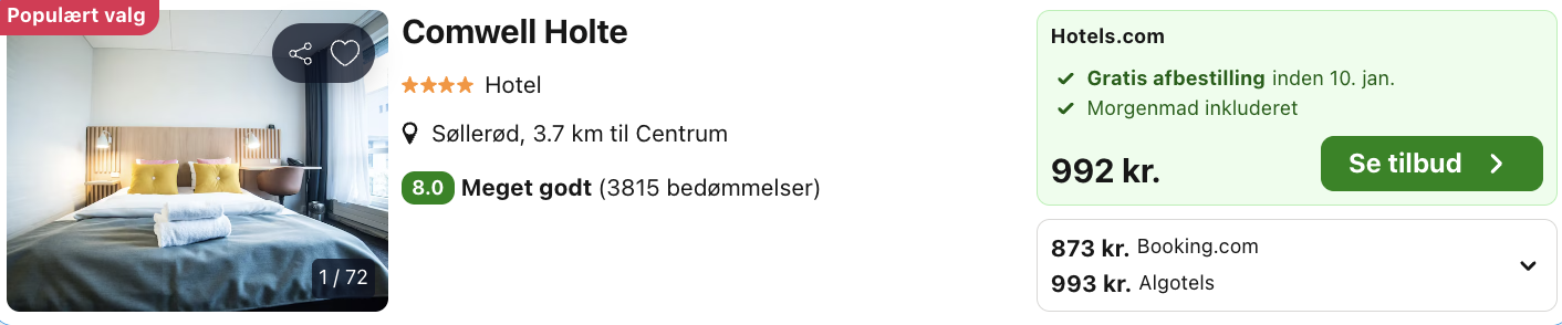 Bemærk: Den samlede pris for opholdet er 873,- for 2 personer i et dobbeltværelse, hvilket svarer til 437,- per person. Der kan være mindre forskelle på prisen på mobil og computer. Undersøg med fordel, hvor det er billigst inden bestilling. Der er flere tilgængelige datoer med attraktive priser på Comwell Holte. Du kan se et udvalg længere nede. Rejs365 er ikke et rejsebureau, men en rejseside der finder gode tilbud! – Vi modtager kommission, men det påvirker ikke din pris! Læs mere her |