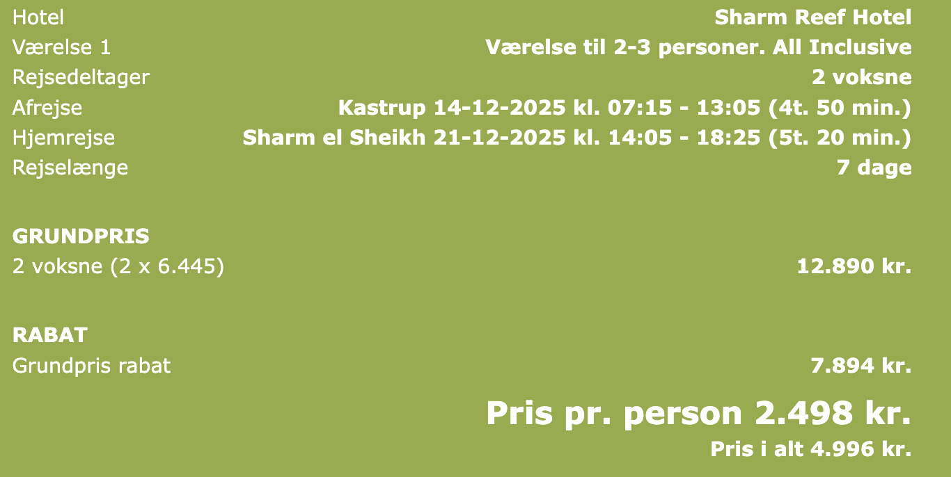 Hvis rejsen er med “Vis rejse” link, så er der tale om en pakkerejse, hvor fly og hotel bestilles på en gang.
