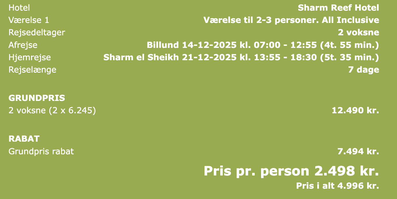 Prisen tager udgangspunkt i 2 personer. Man kan sagtens rejse flere voksne og eller med børn og derved typisk opnå en billigere pris pr. person.