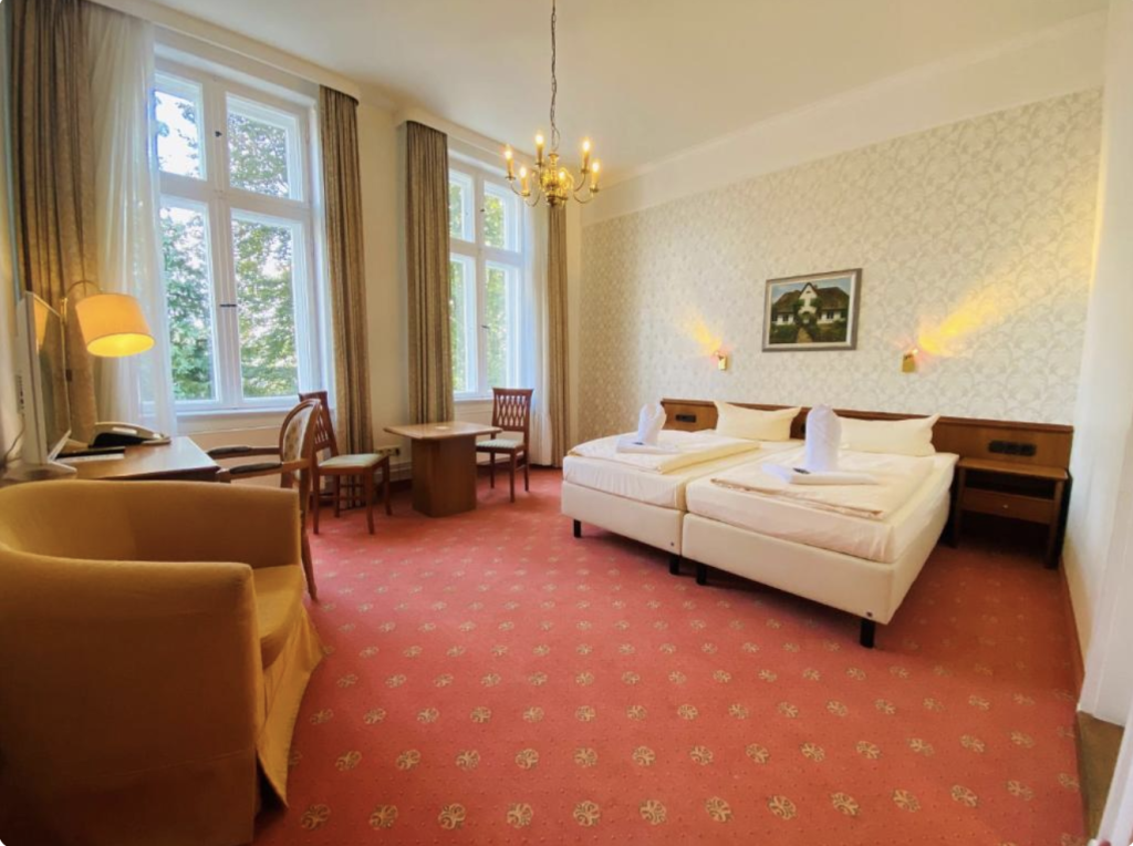 Værelserne er store og har komfortable senge og vinduer, der giver et behageligt lys. Flere af værelserne ligger ud mod hotellets rolige gårdmiljø, hvilket skaber en afslappende base efter en dag i Lübecks smalle gader. Morgenmaden serveres som buffet med et godt udvalg af lokale brød, pålæg og varme retter, og den store spisesal giver en behagelig start på dagen.
