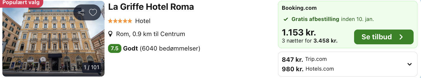 Hvis rejsen er med “Vis fly” og “Vis hotel” link, så er der tale om en sammensat rejse. Det vil sige at fly og hotel skal bestilles hver for sig. Prisen vi angiver vil dog være samlet for fly og hotel med mindre andet er angivet.