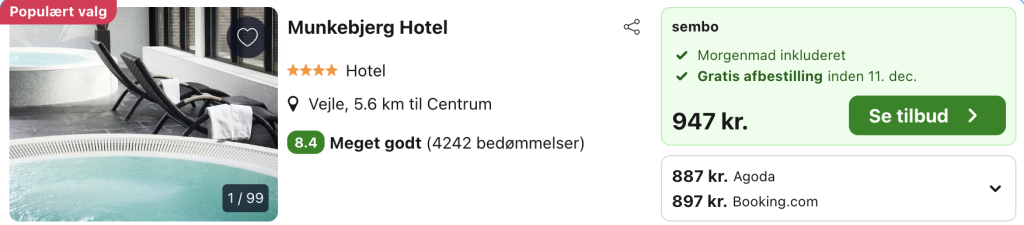 Munkebjerg Hotel er en elegant perle beliggende midt i naturskønne omgivelser ved Vejle Fjord. Hotellet er kendt for sin unikke placering omgivet af skov og med udsigt over vandet, hvilket gør det til en ideel destination for dem, der søger afslapning, forkælelse og smukke omgivelser.