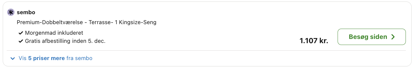 ![]() Bemærk: Den samlede pris for opholdet er 1.107,- for 2 personer i et dobbeltværelse hvilket svarer til 554,- per person.Rejs365 er ikke et rejsebureau, men en rejseside, der finder gode tilbud! – Vi modtager kommission, men det påvirker ikke din pris! Læs mere her |
