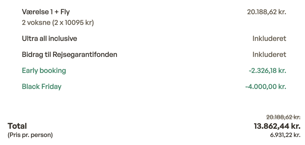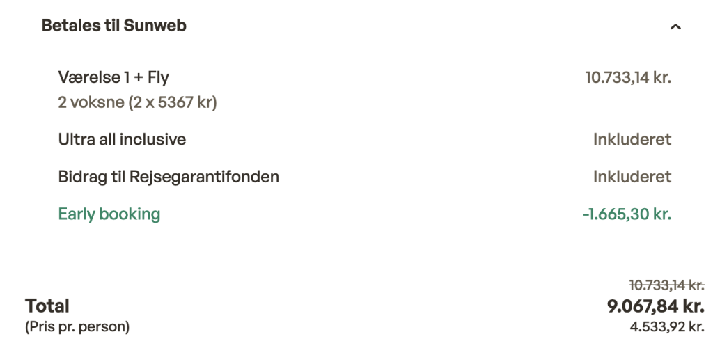 Prisen tager udgangspunkt i 2 personer. Man kan sagtens rejse flere voksne og eller med børn og derved typisk opnå en billigere pris pr. person.