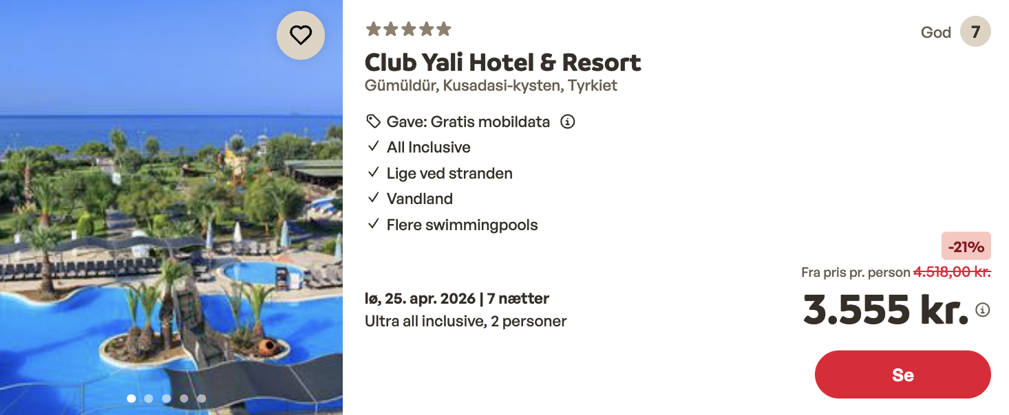 På Club Yali Hotel & Resort bor du i hyggeligt indrettede værelser, der alle er udstyret med enten balkon eller fransk altan. For alle vandhunde findes her også et dejligt vandland med vandrutsjebaner for enhver smag. Ønsker ud at krydre strandferien med udforskning af bylivet, så finder du centrum af Gümüldür ca. 3 km væk, hvor der også i området langs kysten, findes flere butikker, barer dejlige spisesteder.