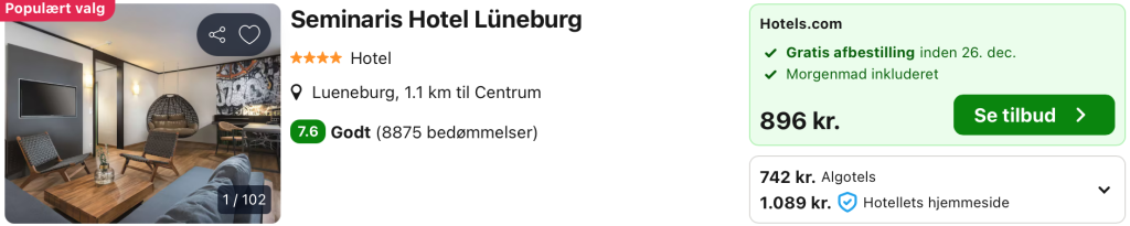 Vi har taget udgangspunkt i et ophold fra den 27. – 28. december på Seminaris Hotel Lüneburg, der ligger i udkanten af den historiske bymidte, lige ved det grønne kurpark-område og med kort afstand til Lüneburgs charmerende gamle gader, bindingsværkshuse og hyggelige caféer. Hotellet har en moderne og afslappet atmosfære med lyse værelser, store vinduer og god plads, ofte med udsigt til parken. Indretningen er inspireret af naturmaterialer og moderne konferencestil, hvilket gør stedet velegnet til både ferie, wellness og forretningsophold.