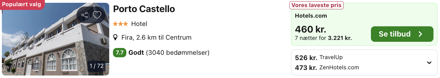 Hvis rejsen er med “Vis fly” og “Vis hotel” link, så er der tale om en sammensat rejse. Det vil sige at fly og hotel skal bestilles hver for sig. Prisen vi angiver vil dog være samlet for fly og hotel med mindre andet er angivet.