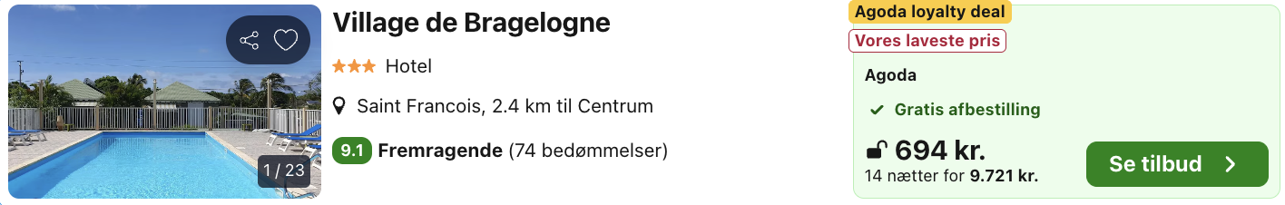 Resortet ligger i grønne omgivelser, men samtidig tæt på Saint-François’ strande, marina, restauranter og aktiviteter, så man får en god balance mellem fredelig base og nem adgang til øens oplevelser. Village de Bragelogne er et oplagt valg for dem, der ønsker fleksibilitet, komfort og et roligt udgangspunkt for at udforske Guadeloupe.