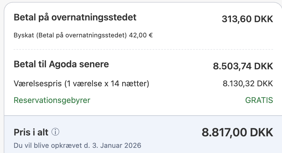 | Bemærk: Den samlede pris for hotellet koster 8.817,- for to personer i et dobbeltværelse, hvilket er 4.409,- pr person. |