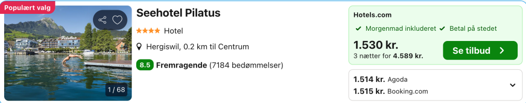 Vi har taget udgangspunkt i det 4-stjernede Seehotel Pilatus, der ligger ved bredden af Luzern-søen. Hotellet byder på stor indendørs pool, spabad og gratis wi-fi. De rummelige værelser har aircondition samt udsigt over bjergene og store vinduer samt fladskærms-tv og radio. Nogle af værelserne har møblerede balkoner med udsigt over søen. Wilhelm Tell Restaurant byder på internationale retter og spisning ud til søen. Pilatus har en natklub med levende musik, og et fitnesscenter med udstyr til konditionstræning.