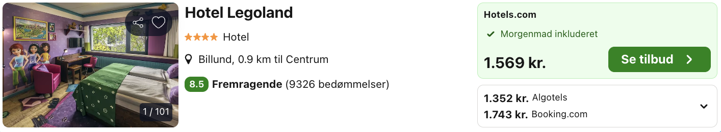 | Bemærk: Den samlede pris for hotellet koster 1.352,- for fire personer i et Lego værelse, hvilket er 338,- pr person. |