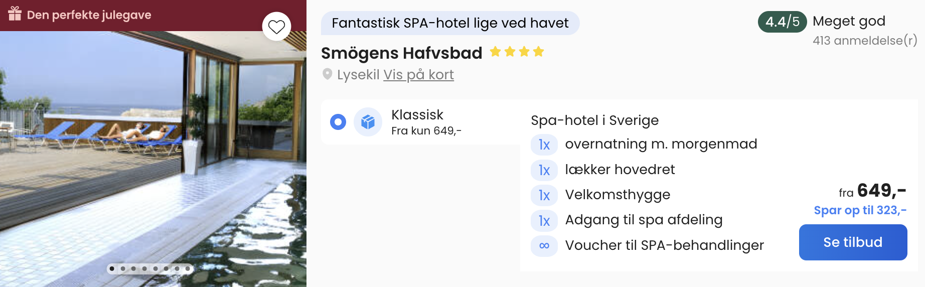 Vi har taget udgangspunkt i et ophold fra den 11. – 12. januar, men der er mange andre datoer i december og i 2026 på Smögens Hafvsbad til gode priser.