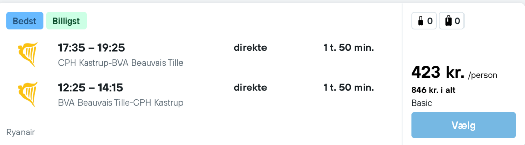 Tjek altid datoerne for at se om de passer sammen før du bestiller, da vi kan have begået fejl. Tjek derudover også prisen på begge ting før du bestiller det ene, da prisen kan have ændret sig. Der kan også være små variationer i prisen mellem mobil og pc.