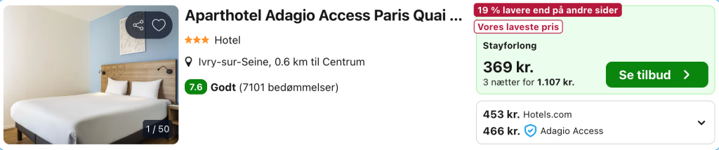 Bemærk: Der kan være mindre prisforskelle på mobil og pc. Undersøg med fordel, hvor det er billigst inden bestilling. Vælg “Vores laveste pris” på trivago, for at opnå den bedste pris på hotellet.