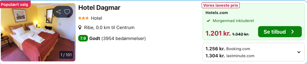 Hotel Dagmar er Danmarks ældste hotel, beliggende midt i hjertet af Ribe, lige ved siden af den imponerende Ribe Domkirke. Hotellet emmer af historie og charme med sin gamle bindingsværksbygning og klassiske indretning, som skaber en unik atmosfære, hvor du kan opleve ægte dansk hygge og autenticitet. Hotel Dagmar tilbyder komfortable værelser og en hyggelig restaurant, hvor lokale og sæsonbaserede retter er i fokus, perfekt til en afslappende og historisk ferie i landets ældste by.