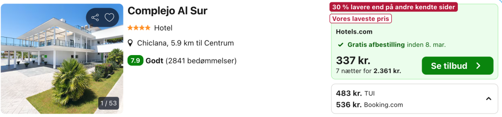 Hvis rejsen er med “Vis rejse” link, så er der tale om en pakkerejse, hvor fly og hotel bestilles på en gang.