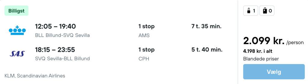 På vores flysøgemaskine har vi fundet billige flybilletter fra København, Aalborg og Billund til Sevilla: